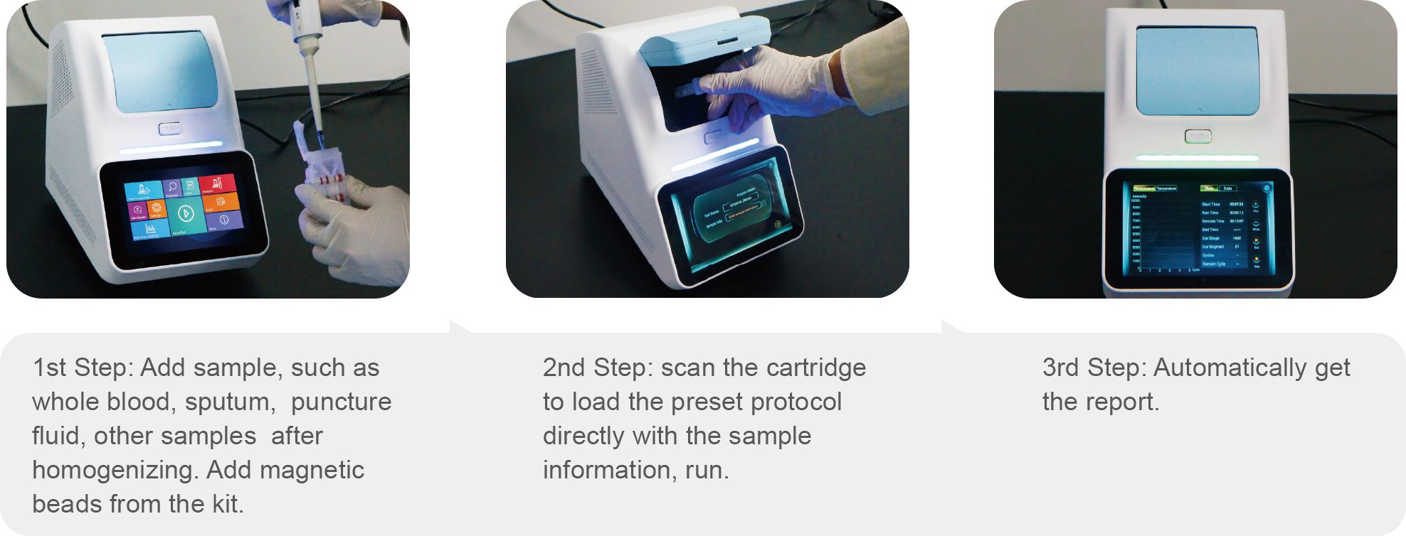 From sample to report as less as in 1 hour---The whole process, including the extraction, purification, amplification and detection of sample, will be done in about one hour, which shortens the period of detection.