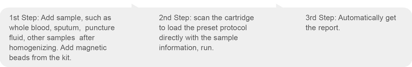From sample to report as less as in 1 hour---The whole process, including the extraction, purification, amplification and detection of sample, will be done in about one hour, which shortens the period of detection.