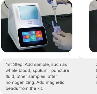Fully-closed Microfluidic Kit, No Contamination---Without need of a three-part PCR laboratory, on-site detection after sampling can be realized through fully enclosed microfluidic cartridge. The ready-to-use kits do not require any dosage with the extraction reagents and detection reagents preassembled.